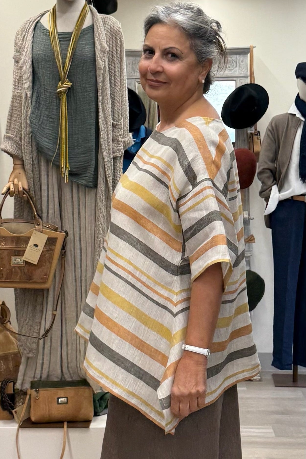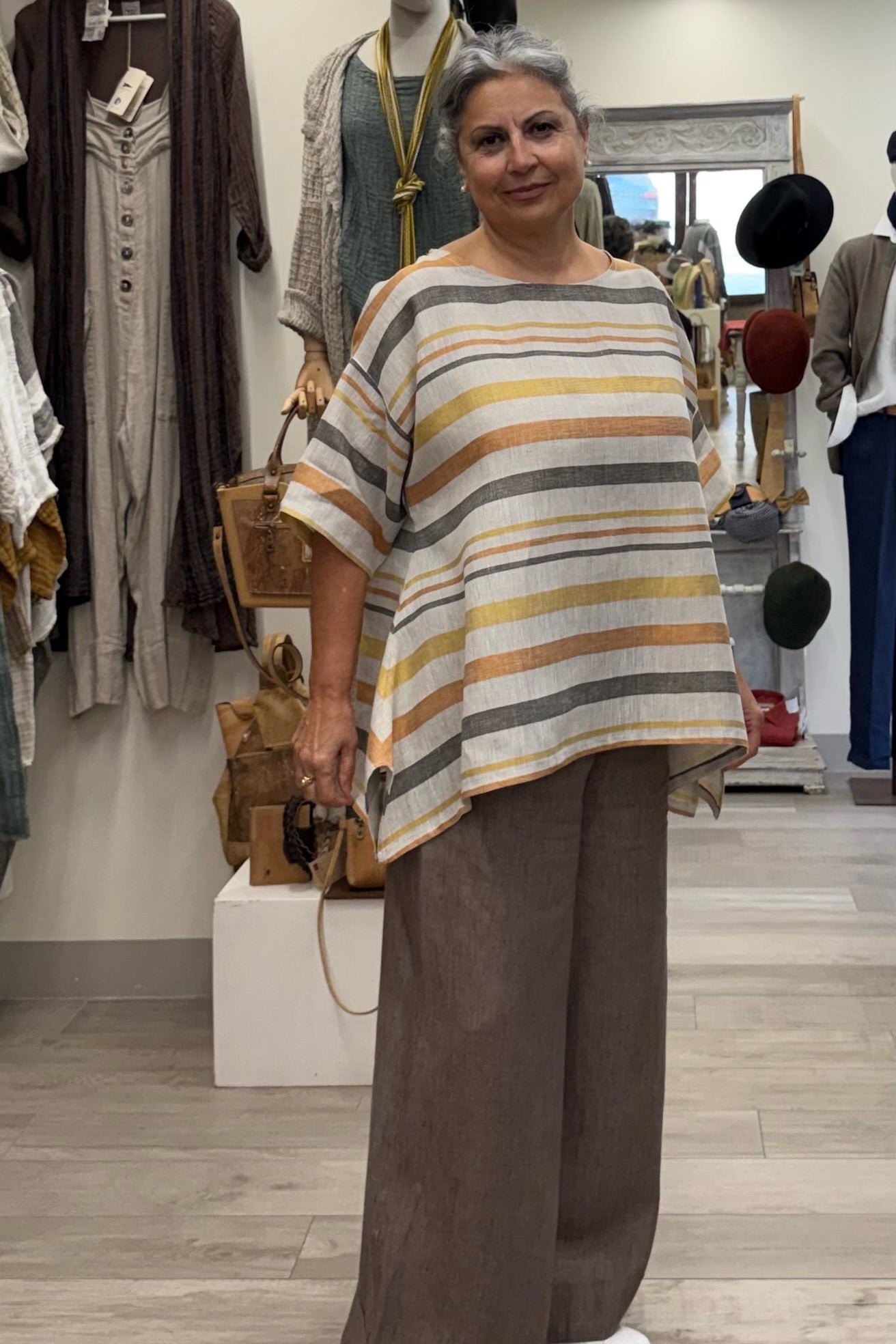Ampia e comoda blusa puro lino, dal taglio minimalista, con punte laterali. Il tessuto con cui viene realizzato questo capo è una celebrazione dell'arte della tessitura tradizionale, dando spazio a raffinate lavorazioni: dalla tessitura classica alla spigatura, fino alla delicata rete, creando un gioco di colori, trame e texture. Un capo che unisce maestria artigianale e comfort naturale.